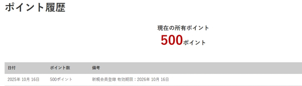 会員登録が完了したら、すぐに500ポイントがもらえます。