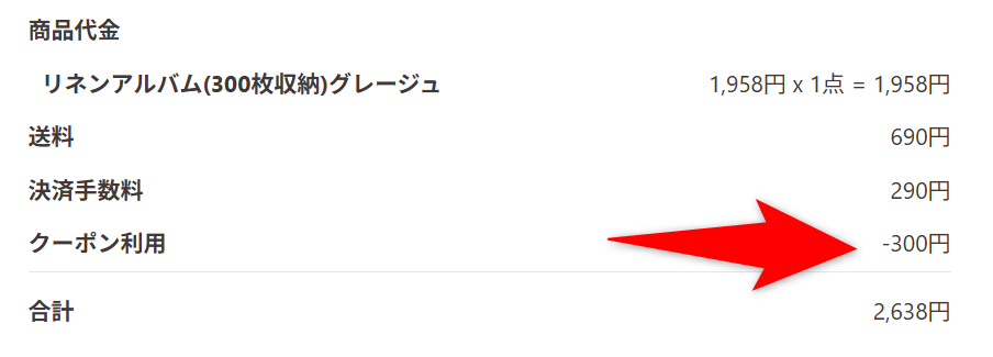 購入前にコードを入力すると、自動的に300円OFFされるので、忘れずに使いましょう。